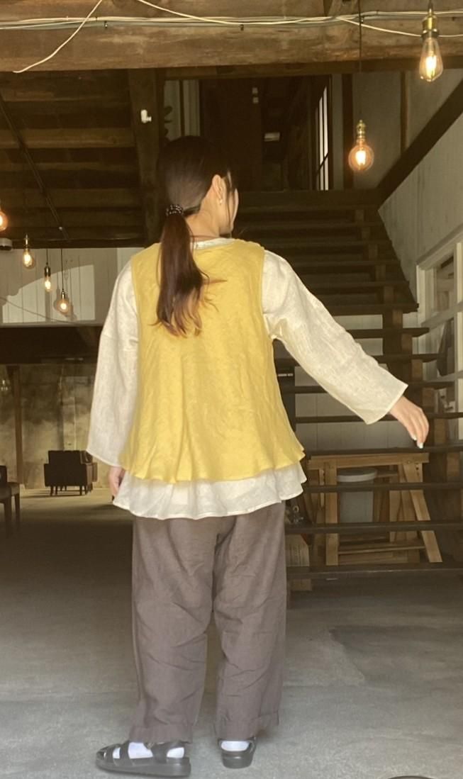 今回は発色のいいオリジナルの天日干しリネンベスト合わせてみました。