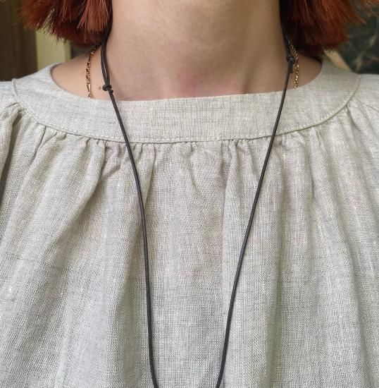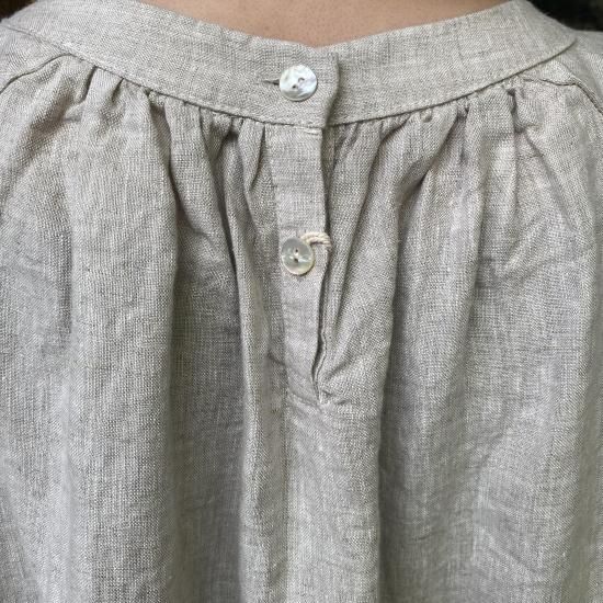 襟ぐりにはギャザーをほどこしてあるため生地をたっぷりと使っていますが、自然なドレープ感がでてスッキリとした印象もあり、ナチュラルながらも優雅さもあります。