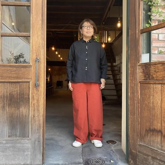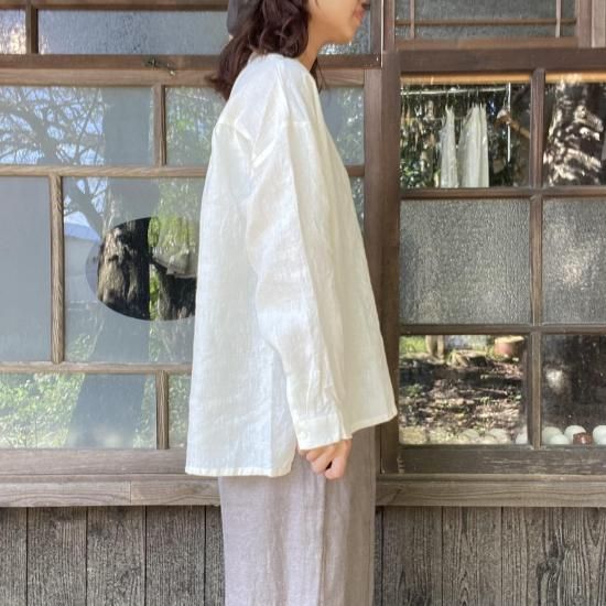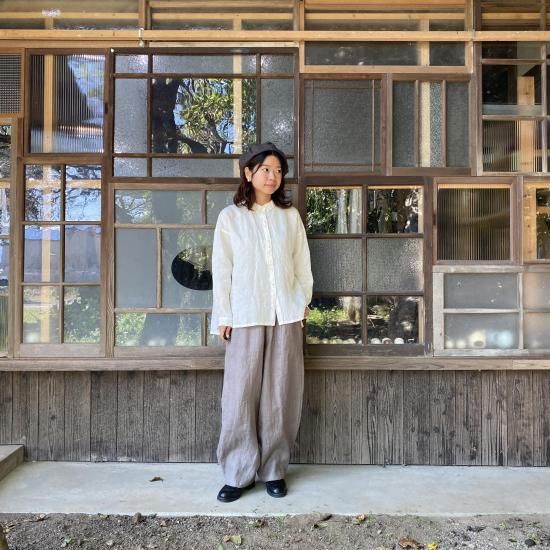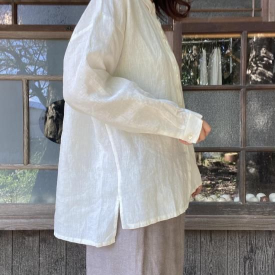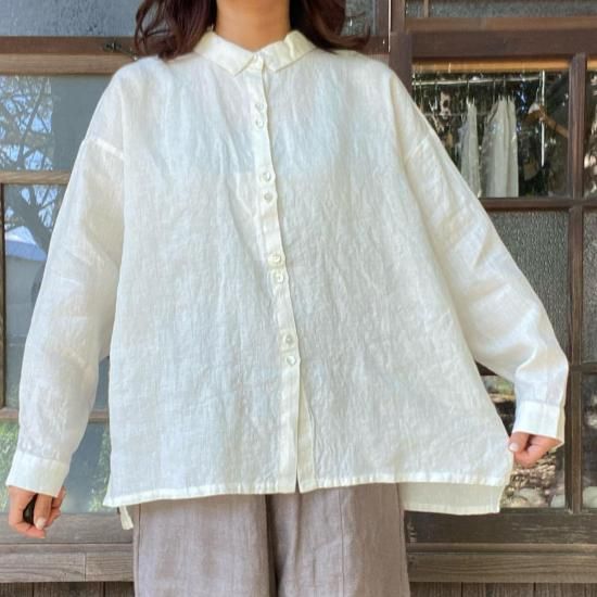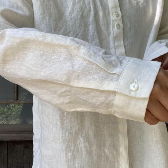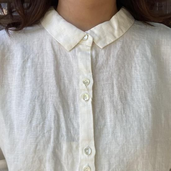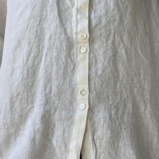 【アイテム説明】襟付きのリネンシャツ。シンプルなデザインでダブルボタンが目を惹くお洒落ポイント。