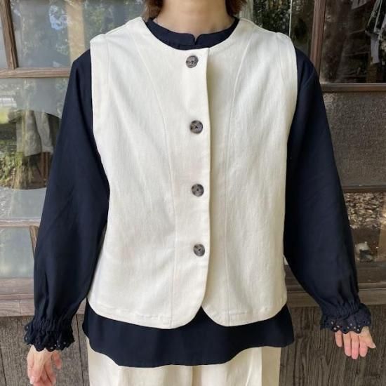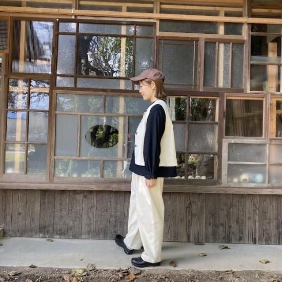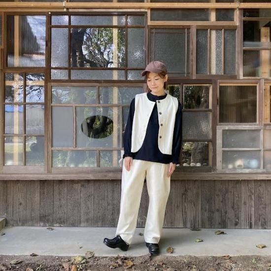 【アイテム説明】前後着用可能な嬉しい2way仕様。伸縮性のあるコットンストレッチベスト。微起毛の素材で秋冬にオススメアイテム。ゆったりとした身幅と、広めのアームホームで厚手の物とも重ね着が楽しめます。ショート丈なので小柄さんも着やすくなっております。同素材のパンツとセットアップ可能。
